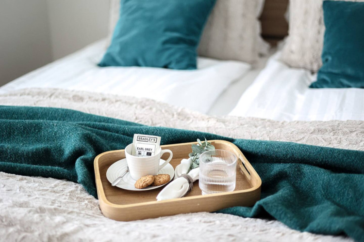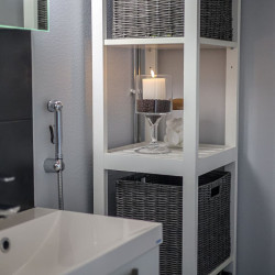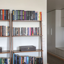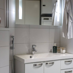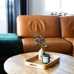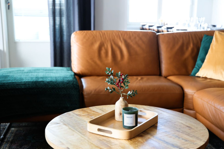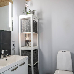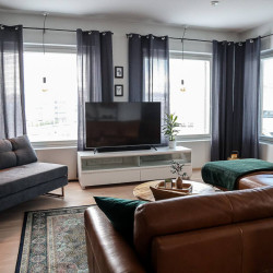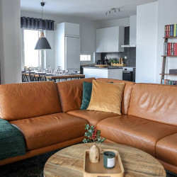 That’s comfortable sleeping for up to 8 guests. Cook together in the fully equipped, modern kitchen with an island and gather at the large wooden dining table. After dinner, unwind in the cozy lounge with a comfy sectional and big windows, or browse the curated bookshelf for an evening read. A fresh, modern bathroom make your stay even more comfortable.