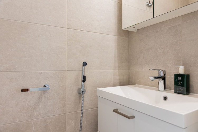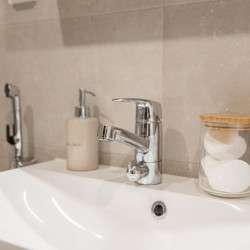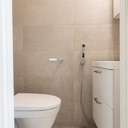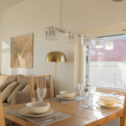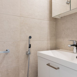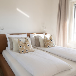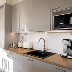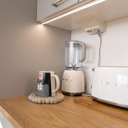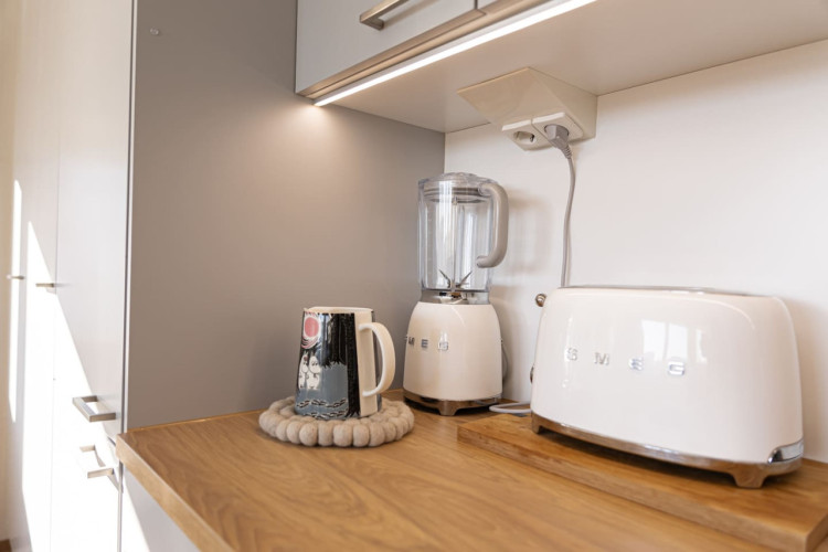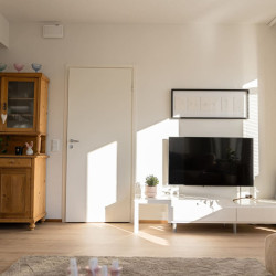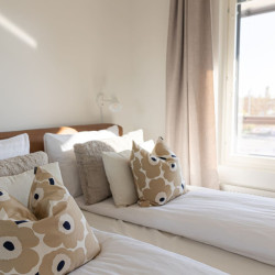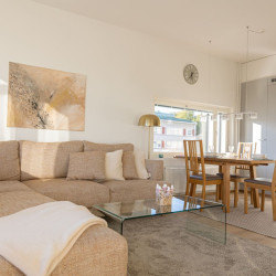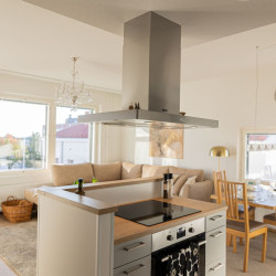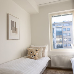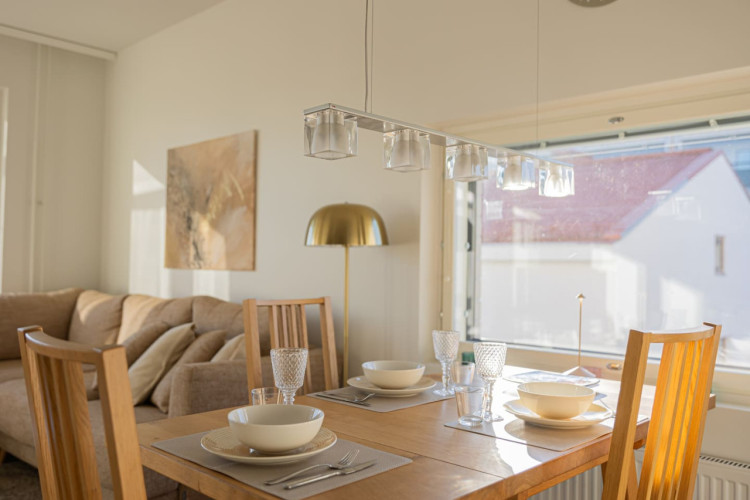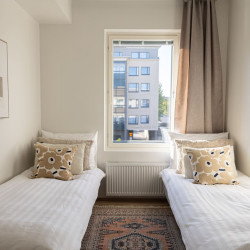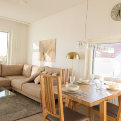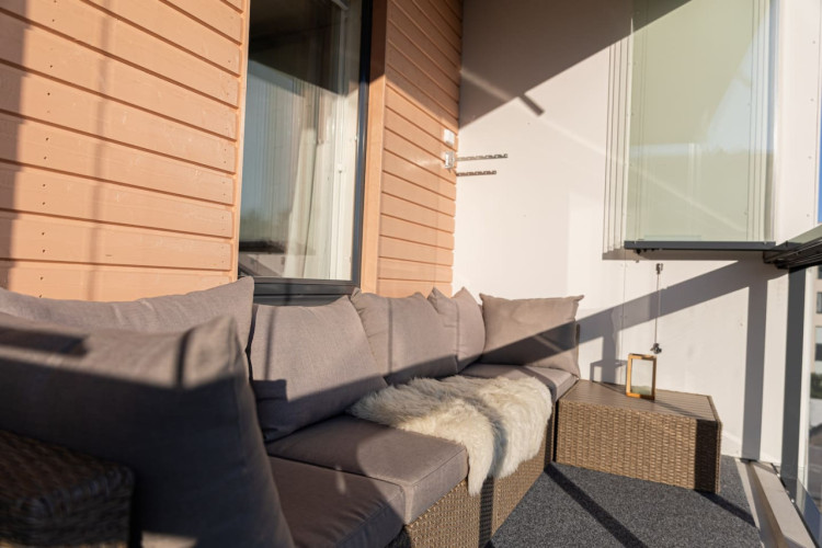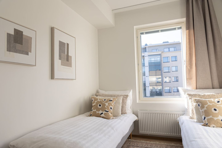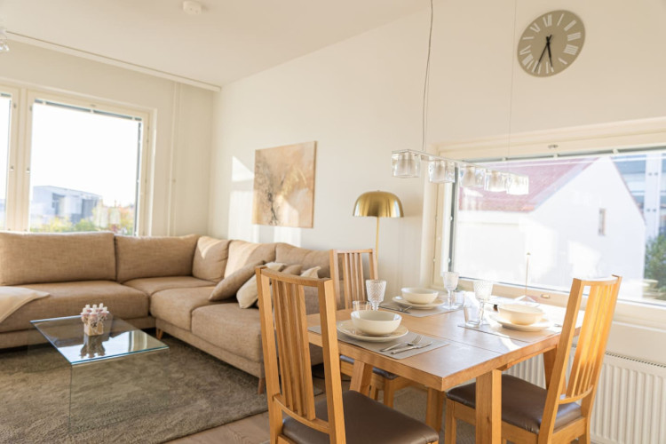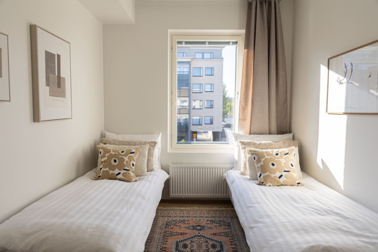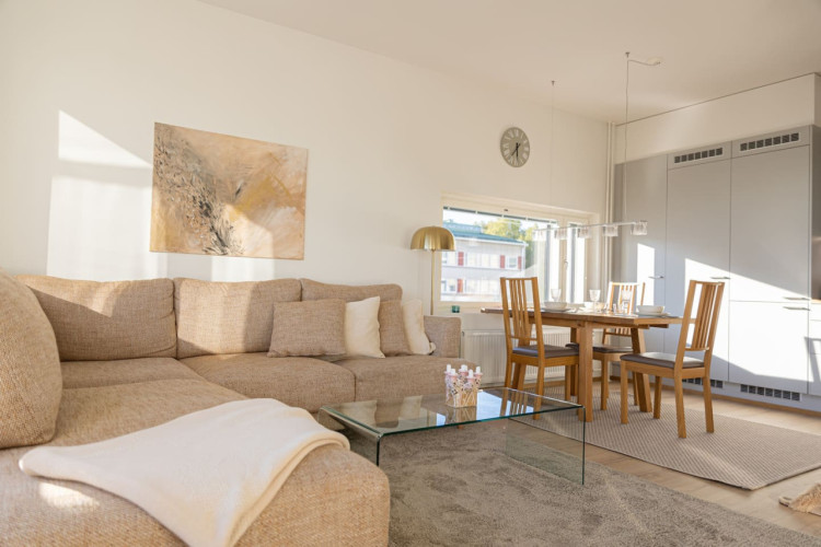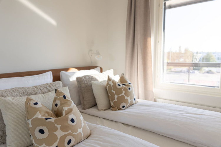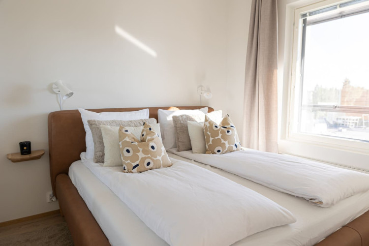 This brand-new 2-bedroom city apartment is located in the heart of downtown, with shops and services just steps away. The master bedroom features a luxurious Tempur double bed, while the second bedroom has two single beds. An extra bed is also available, comfortably accommodating additional guests. A heated parking space in the garage is included at no extra cost, ensuring a convenient and comfortable stay.