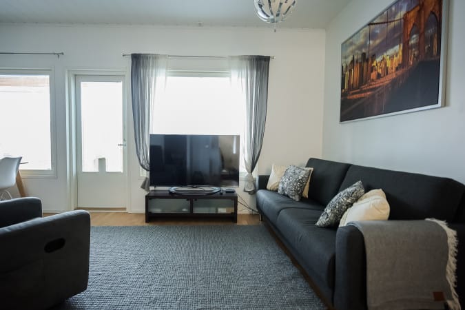 Relax in this peaceful and stylish space, equipped with everything you need for a carefree holiday. The apartment features two bedrooms, one private bathroom, and three beds (king, double, and single). Enjoy a spacious living room with a fireplace, a full kitchen with modern appliances, and a private sauna. The balcony offers a beautiful waterfront view, and there’s a dining area with a table for shared meals. Additional amenities include an EV charger, Wi-Fi, and entertainment systems. Ideal for families, couples, or groups looking for a luxurious, nature-connected stay in Rovaniemi.