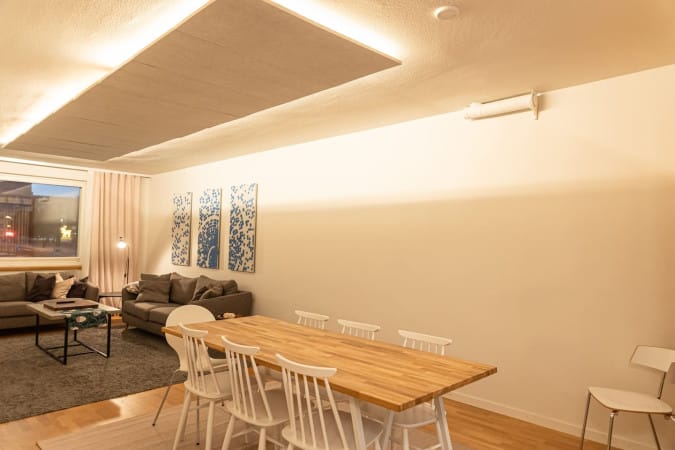 Experience a relaxing Arctic escape in the heart of Rovaniemi. Santa’s Premium Suite offers spacious comfort for families or groups, with three bedrooms and six beds to accommodate up to 8 guests. Located near local attractions, shopping streets, and restaurants, this apartment includes a private sauna, high-speed Wi-Fi, balcony, and fully equipped kitchen. Ideal for guests seeking style, convenience, and comfort in Lapland’s capital.